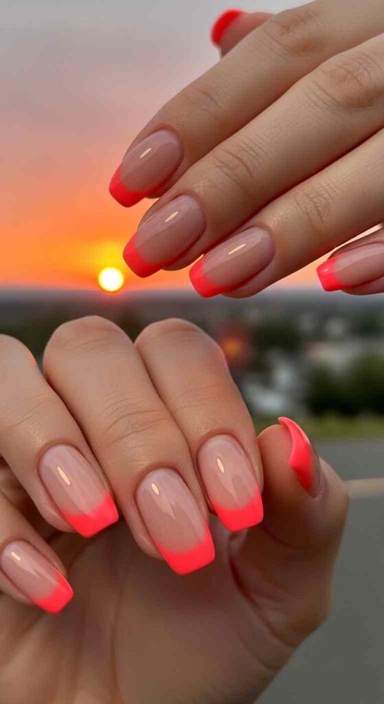 Vibrant coral-pink tips creates warm summer brightness.