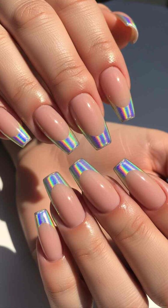 Iridescent holographic tips creates magical summer shimmer.