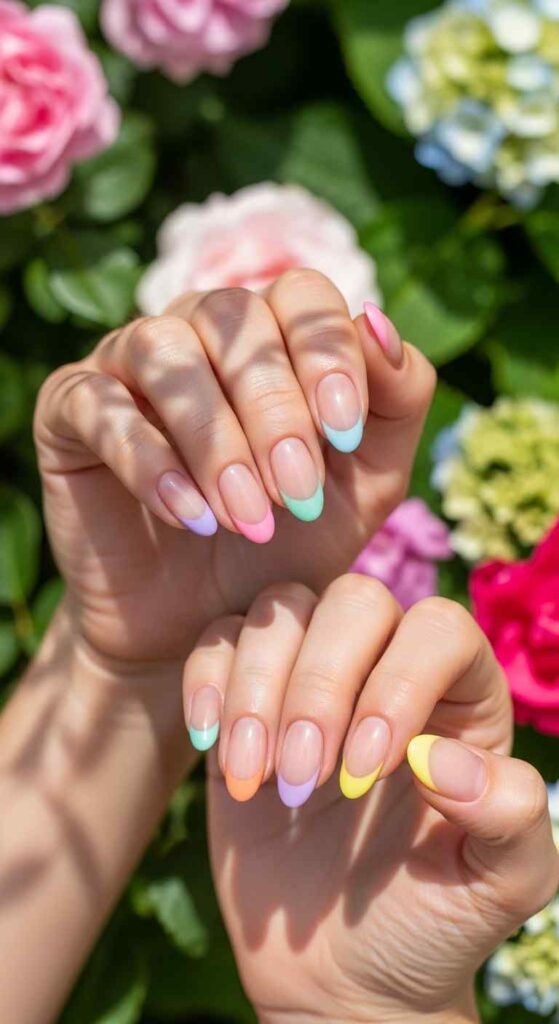 Each nail different pastel tip creates playful summer variety.