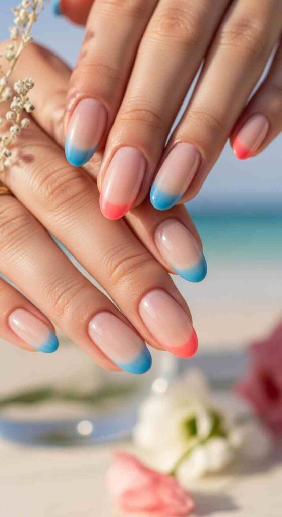 Tips fading from nude to summer color creates soft summer transition.