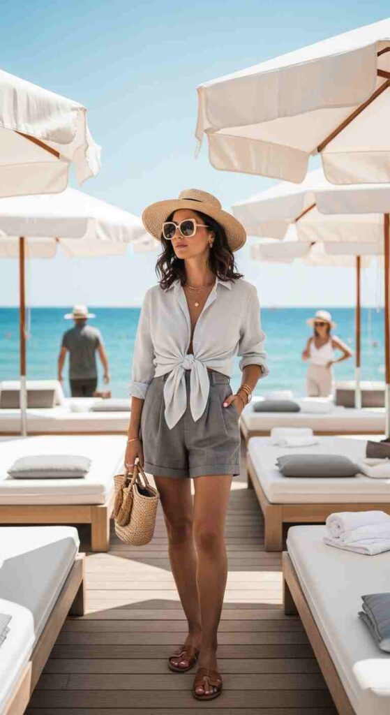 Oversized white linen shirt tied at waist over simple shorts creates beachy ease. The shirt becomes styling element rather than traditional cover. Straw hat and beach bag complete the Mediterranean beach club look.