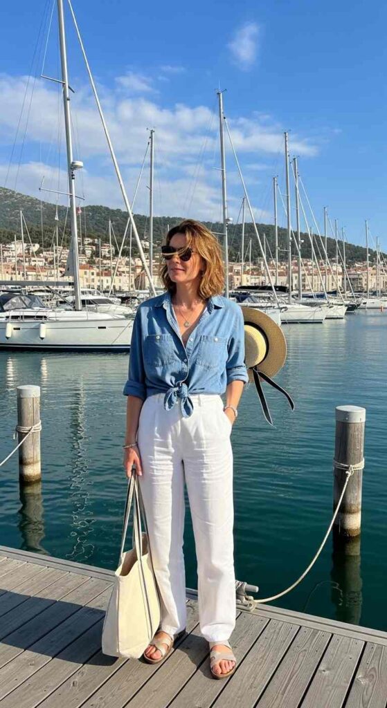 Light chambray button-down half-tucked into white linen wide-leg pants creates crisp contrast. The denim-on-white feels fresh and effortless. Tan accessories and minimal jewelry maintain the relaxed European sensibility.