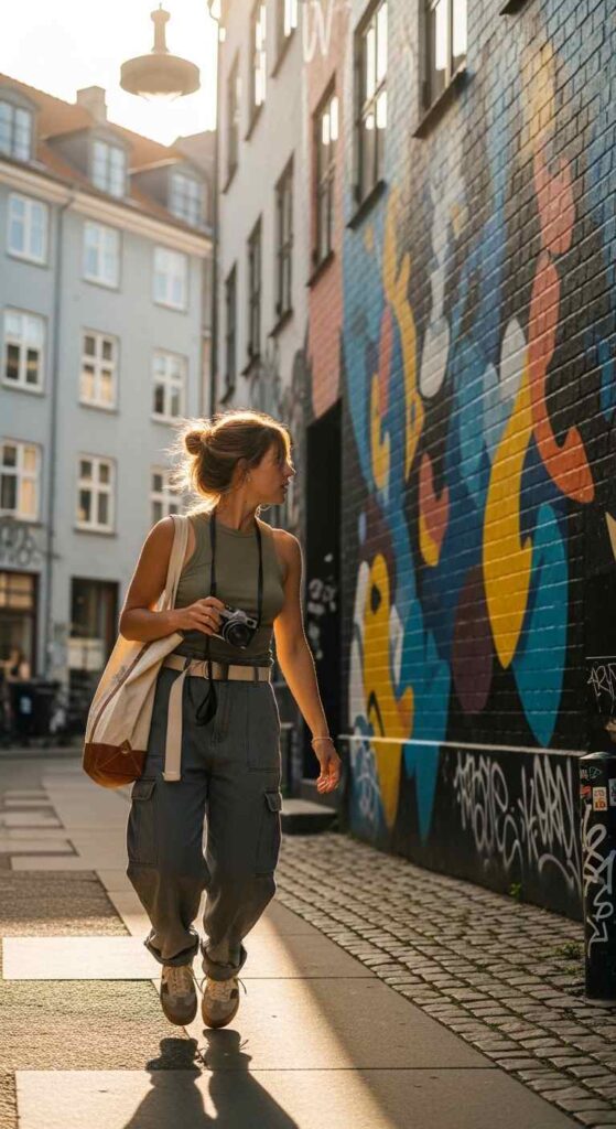 Black ribbed tank tucked into olive cargo pants creates utilitarian chic. The functional pants feel current when styled with simple tank. Combat sandals and crossbody bag add to the relaxed urban explorer aesthetic.