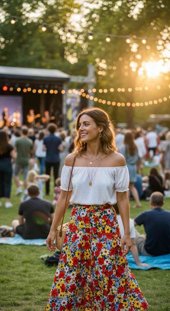 White off-shoulder peasant top paired with flowing floral midi skirt creates romantic femininity. The exposed shoulders feel summery while remaining elegant. Flat sandals and simple jewelry maintain the relaxed European romance.