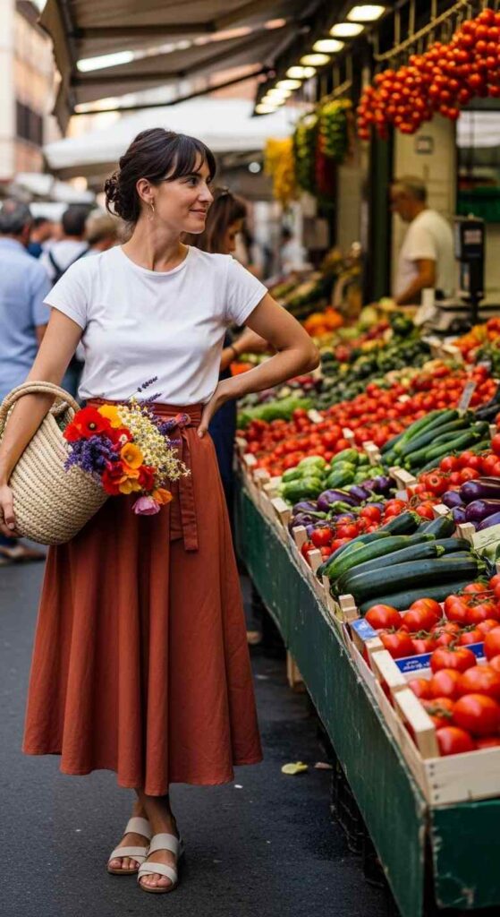 Flowing midi skirt in terracotta paired with simple white t-shirt tucked creates easy sophistication. The skirt adds elegance while the tee keeps it grounded. Leather sandals and woven bag complete this Italian market-ready look.