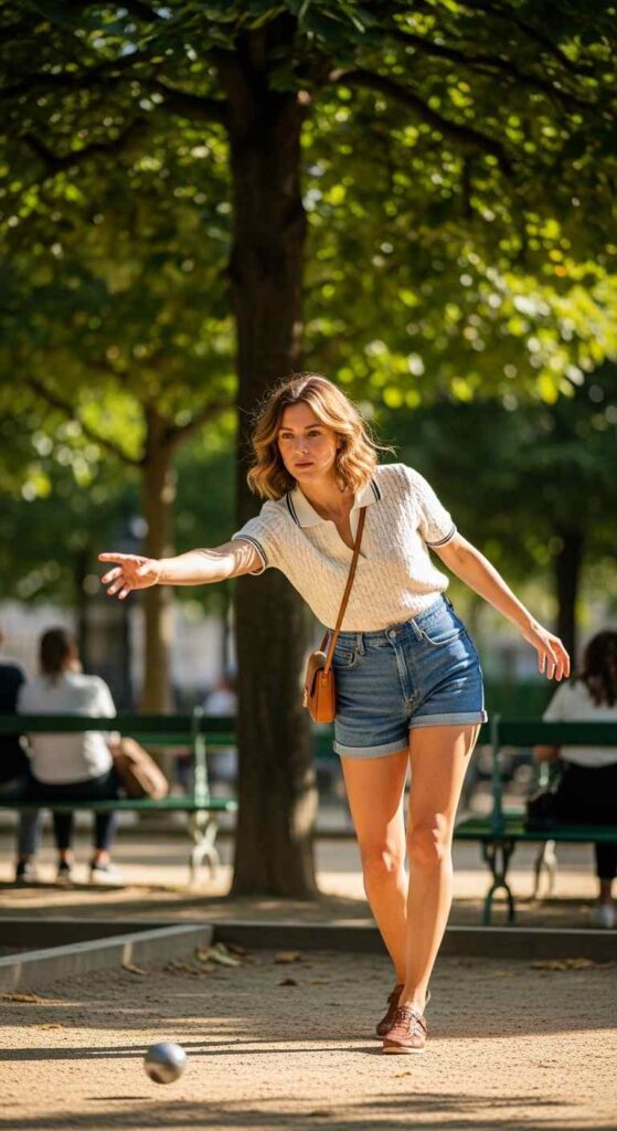 Fitted short-sleeve knit polo in cream paired with relaxed denim shorts creates preppy European ease. The elevated top makes shorts feel sophisticated. Canvas sneakers and minimal accessories keep it youthfully classic.