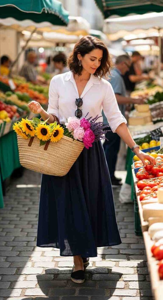 Button-front denim midi skirt paired with crisp white cotton blouse creates fresh summer dressing. The denim skirt is more refined than shorts while remaining casual. Espadrilles and straw hat finish the countryside-ready look.