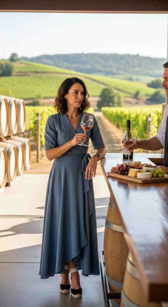 Linen wrap dress in dusty blue creates one-piece elegance. The wrap silhouette flatters while remaining completely comfortable. Simple with flat sandals and basket bag for farmer’s market to lunch versatility.