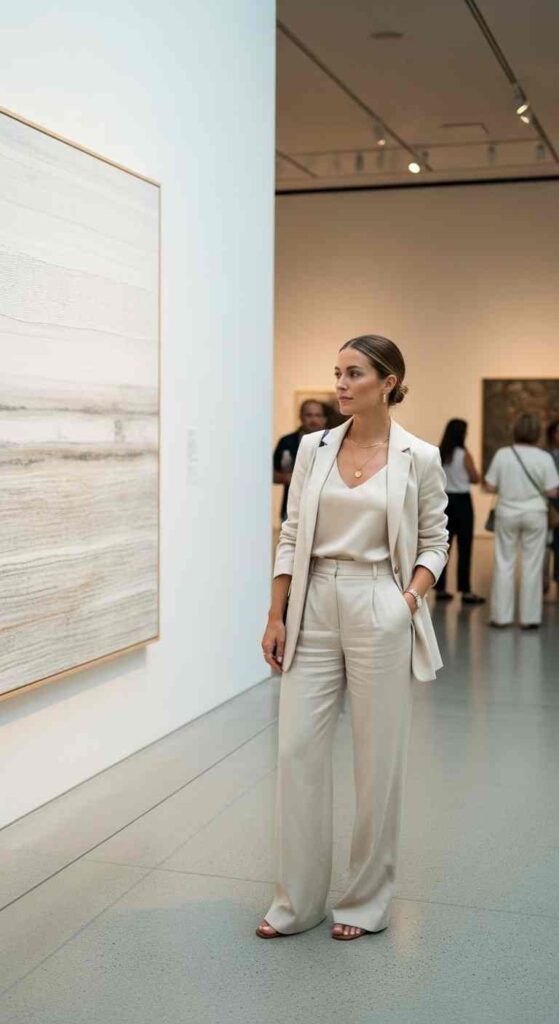 Short-sleeve cropped cardigan in cream over white crop top with high-waisted wide-leg pants in beige creates tonal sophistication. The monochrome approach feels modern and European. Minimal accessories maintain the clean aesthetic.