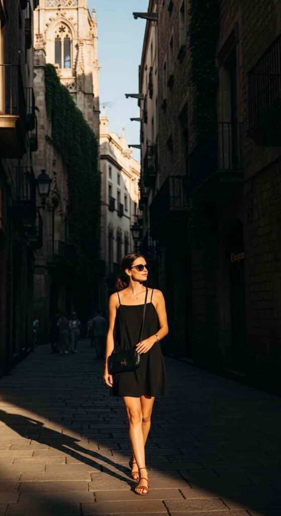 Simple black jersey tank dress becomes European staple through quality fabric and confident styling. The uniform black is sophisticated canvas for accessories. Paired with cognac leather sandals and gold jewelry for understated elegance.