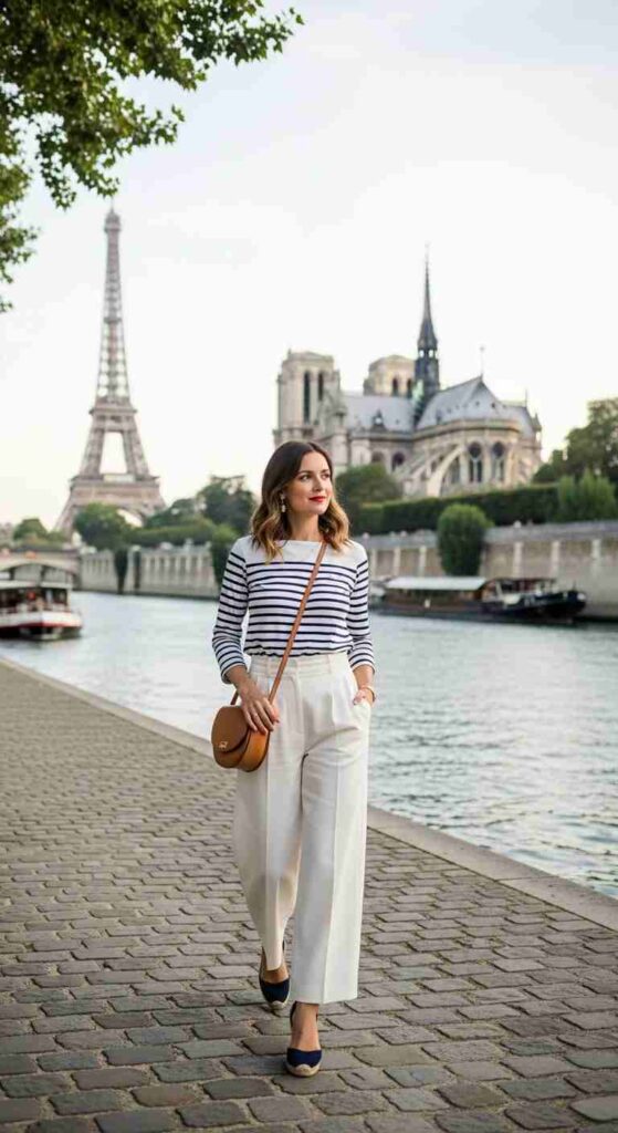 Classic navy and white striped sailor top paired with cream wide-leg linen trousers creates Parisian timelessness. The nautical-inspired combination never dates. Finished with navy espadrilles and red lip for quintessential French style.