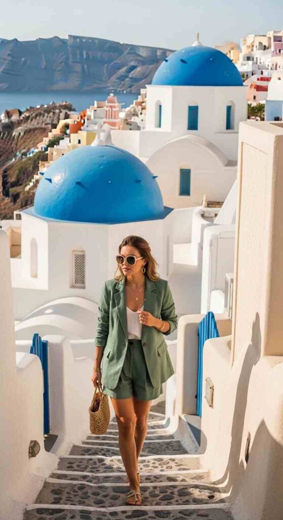 Coordinated linen blazer and shorts set in soft sage creates sophisticated summer suiting. The matching set looks intentional while remaining breathable and casual. Pair with simple white tank and leather slides for polished resort wear.