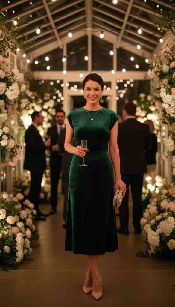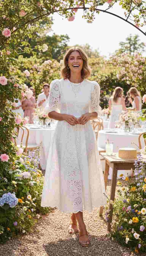 “Cocktail attire” suggests knee-to-midi length dresses or sophisticated separates, heels or dressy flats, and elevated styling. This is where most of the outfits in this guide naturally fall. “Semi-formal” lands similarly, calling for dressy but not ball-gown formal attire. “Garden party” or “daytime celebration” typically means sundresses, lighter colors, and slightly more casual styling while maintaining polish.