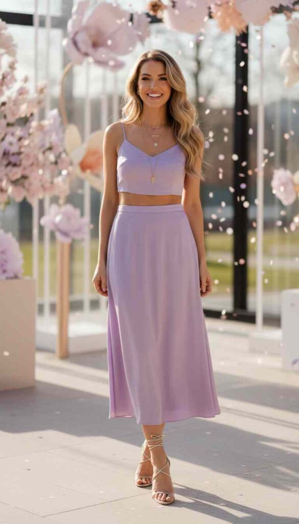 Matching crop top and high-waisted skirt creates modern coordinated party style.