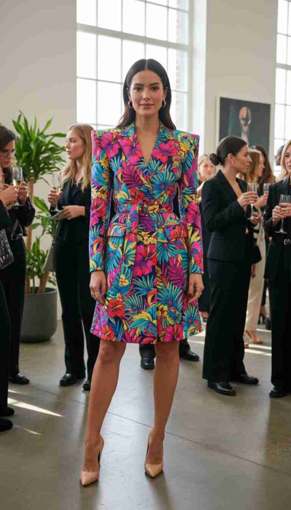 Matching blazer and trousers in floral print creates unexpected party sophistication.