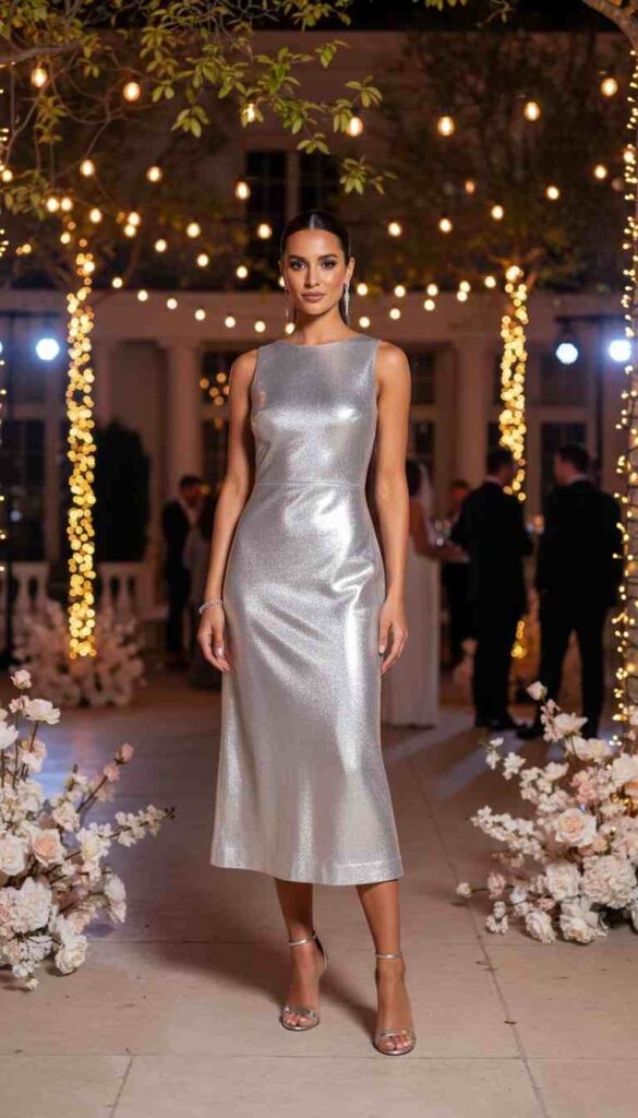 Metallic fabric dress creates light-catching party glamour.