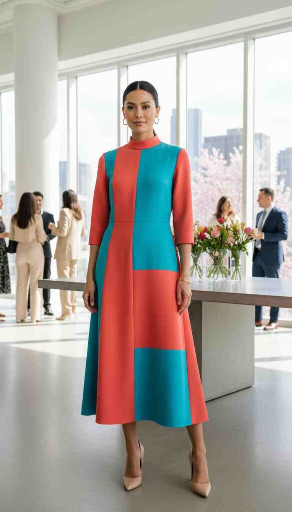 Color-blocked dress in complementary spring tones creates graphic party impact.