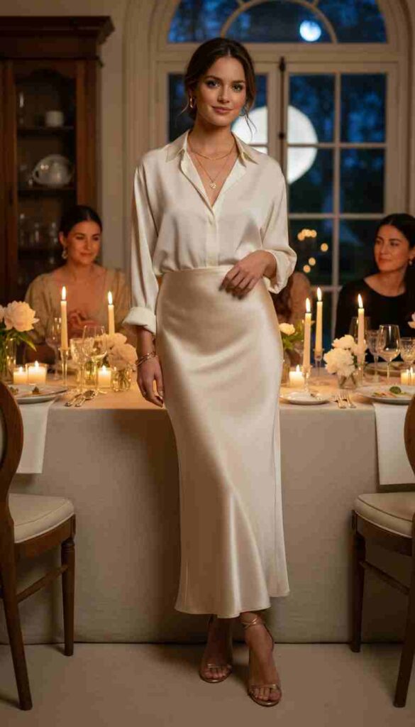 Bias-cut slip skirt with silk blouse creates luxe separated elegance.