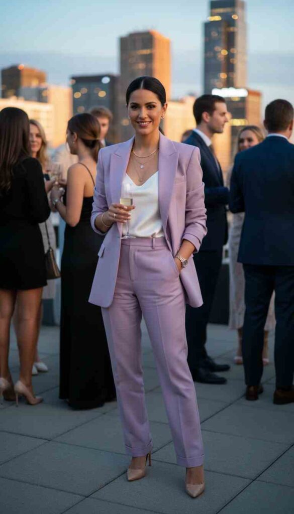 Matching blazer and trousers in soft pastel creates modern feminine power.