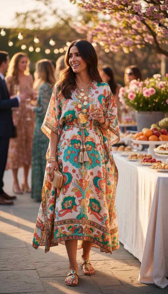 Luxurious printed caftan creates effortless bohemian party elegance.