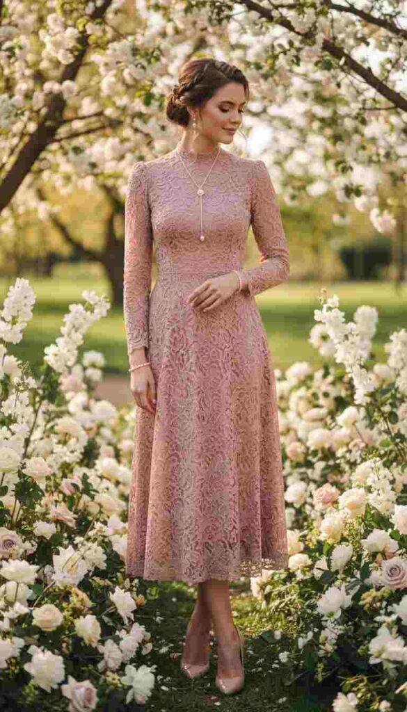 Lace midi dress in spring color creates vintage-inspired romantic beauty.