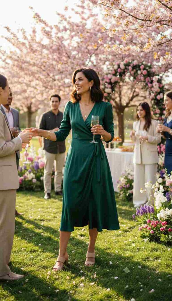 Jewel tones—emerald, sapphire, ruby—create sophisticated drama that photographs beautifully in spring’s natural light. These rich colors suggest luxury and intentionality while remaining appropriate for festive contexts. They particularly shine at evening parties where dramatic lighting enhances their depth and saturation.