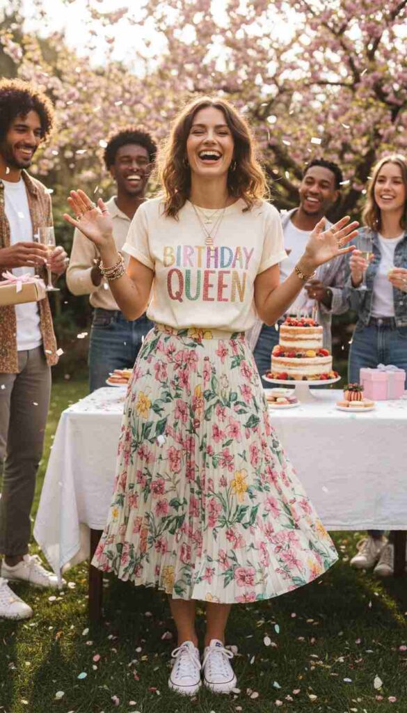 Fun graphic tee tucked into flowy midi creates playful birthday combination.