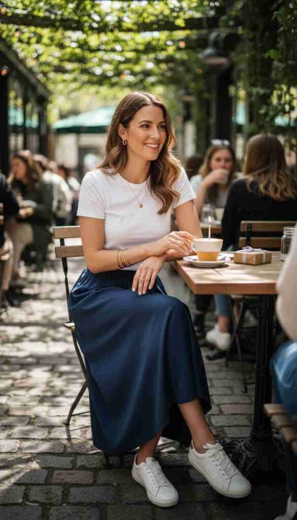 Classic midi skirt with perfect tee creates effortless birthday combination.
