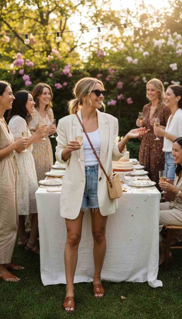 Relaxed blazer over simple top and denim shorts creates casual-chic birthday balance.