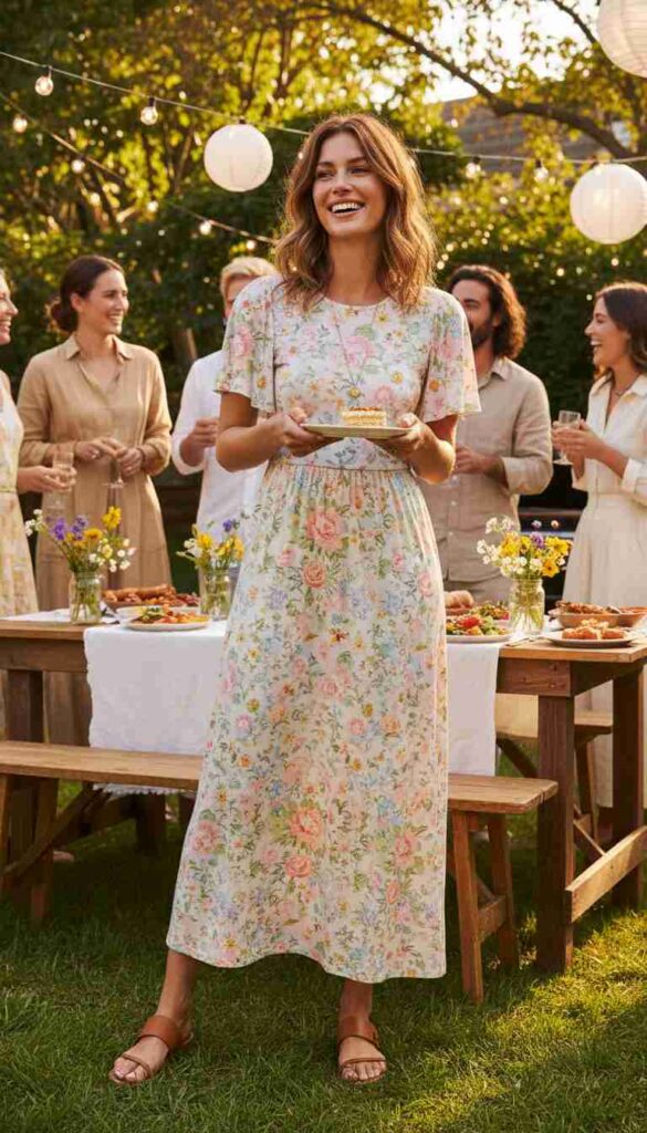 Flowing casual midi in spring print creates breezy birthday comfort.