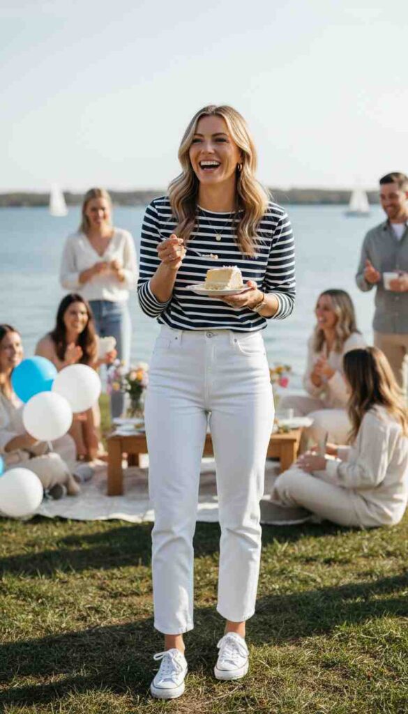 Classic striped shirt with white jeans creates fresh nautical birthday casual.