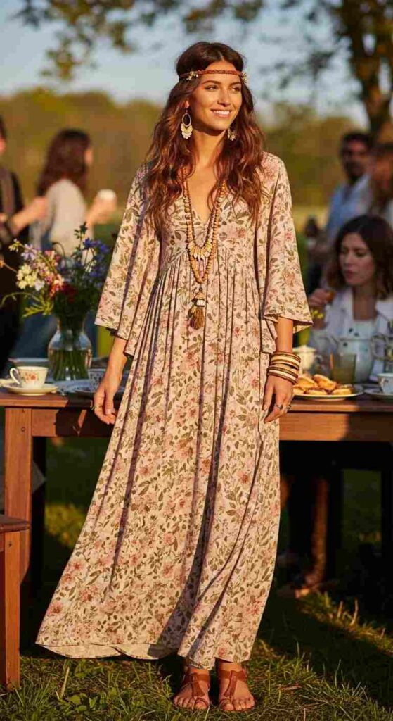 Flowing maxi dress creates bohemian romantic glam ease.