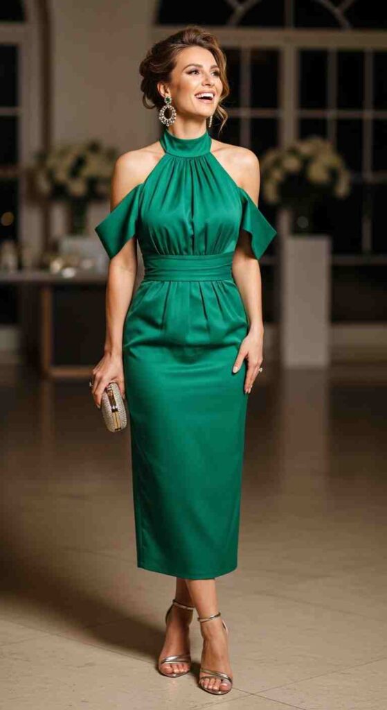 Elegant halter neckline creates sophisticated shoulder-baring glam.