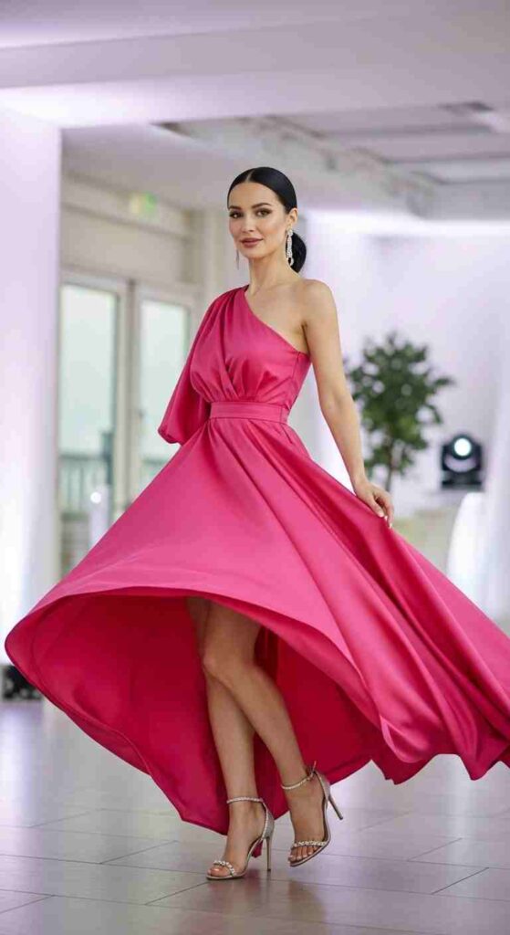 Asymmetric one-shoulder dress creates sculptural glam statement.