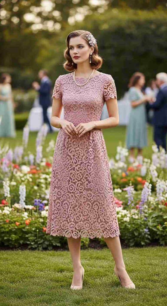 Romantic lace midi creates vintage-inspired glam elegance.