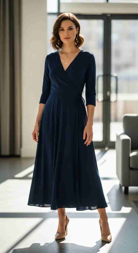 Pear shapes (smaller bust, wider hips) benefit from dresses that create balance through emphasis on the upper body—wrap dresses with defined waists, fit-and-flare silhouettes that skim hips, A-line dresses that flow from natural or empire waists. These shapes prevent lower body emphasis while creating overall proportion harmony.