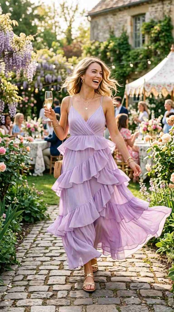 Tiered ruffle maxi dress creates playful feminine glam movement.