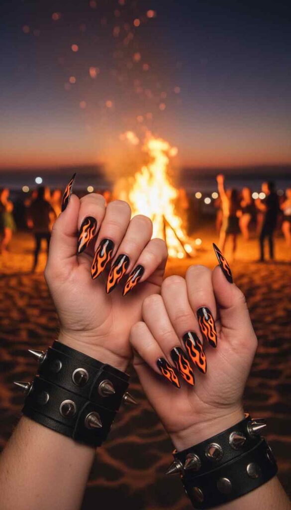 Black base with neon orange flame patterns licking up from the cuticle toward pointed tips creates fire energy. The flames are graphic and bold. This design literally brings the heat.