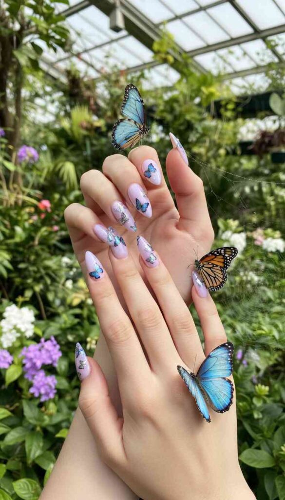 Soft lavender stilettos adorned with delicate butterfly water decals create whimsical femininity. Small butterflies appear to land on select nails. The contrast between sharp shape and delicate imagery works beautifully.