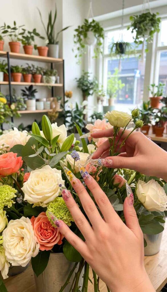 Completely clear acrylic stilettos with real pressed flowers embedded creates botanical transparency. Tiny colorful flowers suspend within the clear nail. This design is unexpectedly fierce through sheer uniqueness.