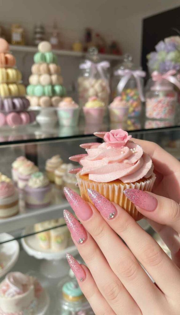 Baby pink base with iridescent glitter concentrating at the pointed tips creates sparkle gradient. The glitter fades naturally toward cuticle. This is sweet with a sharp edge.
