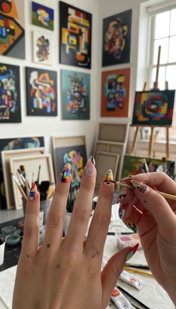 Each stiletto nail features different abstract art in spring colors—brush strokes, dots, geometric shapes. No two nails match but all coordinate. This is wearable modern art with attitude.