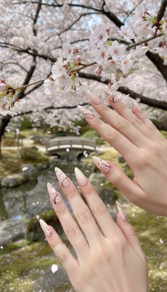 Soft nude stiletto base with delicate hand-painted cherry blossom branches creates feminine contrast. Pink and white blossoms trail artistically across the pointed nails. The sharp shape softens with romantic florals for beautiful juxtaposition.