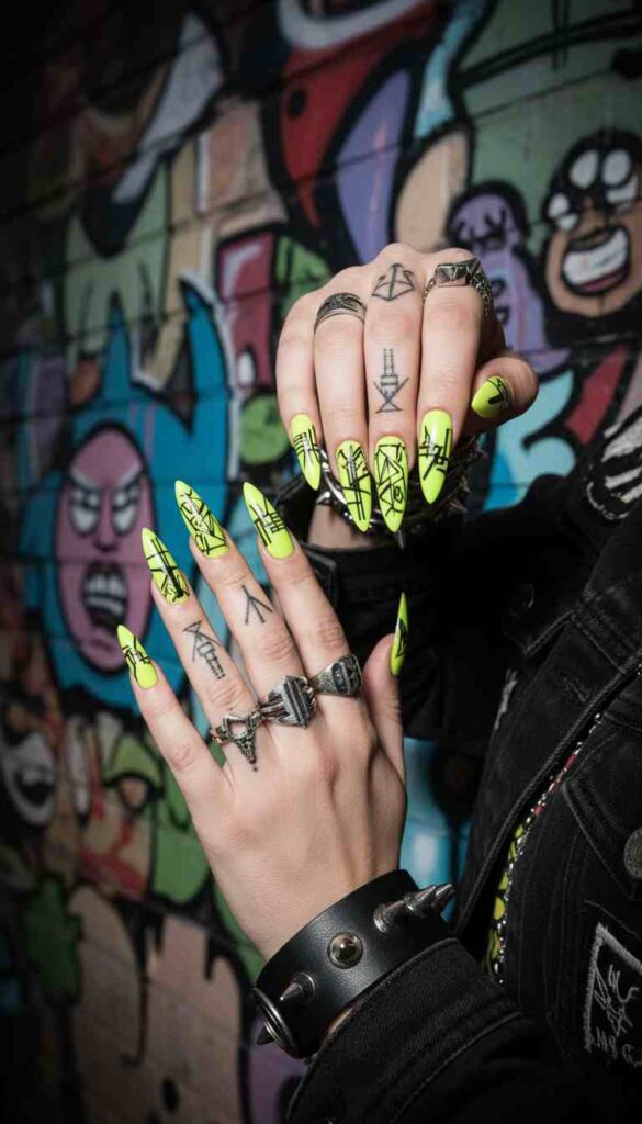Jet black stiletto nails with electric neon green tips create high-contrast drama. The neon sits just at the pointed tips, creating a reverse French effect that’s bold and modern. This color combination screams confidence and contemporary edge.