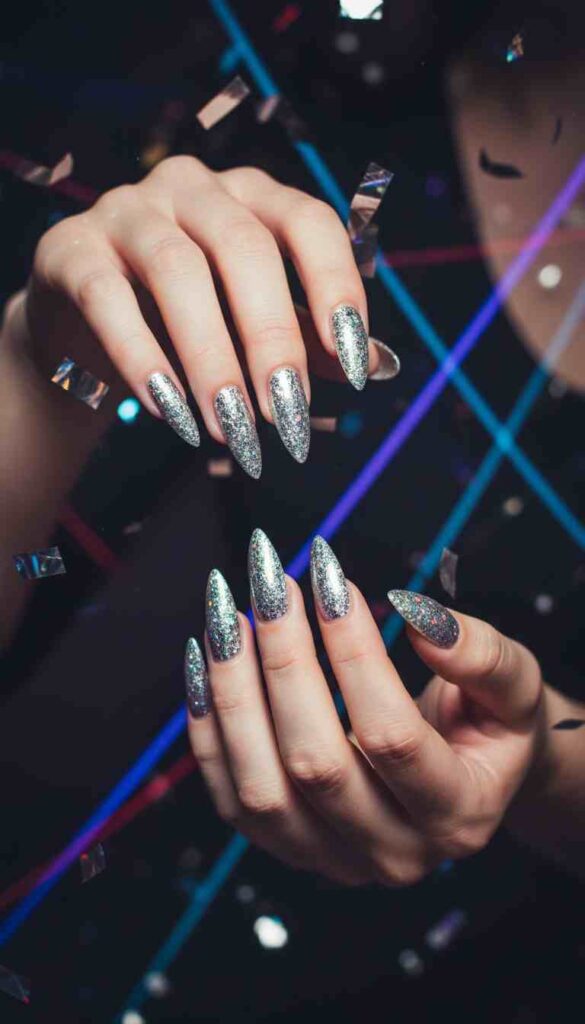 Full silver holographic glitter coverage creates maximum sparkle. Every inch of the stiletto nail catches and reflects light. This is disco-ball hands for the fearlessly glamorous.