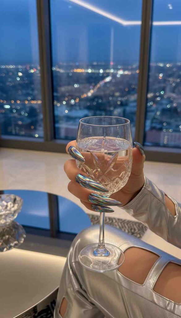 Full holographic chrome finish on sharp stiletto nails creates futuristic shine. The chrome shifts colors in light—purple, blue, green, pink—for maximum impact. This mirror-like finish amplifies the dramatic shape perfectly.