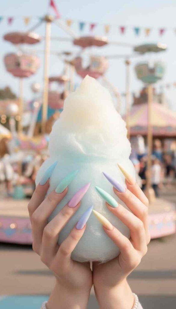 Each nail flows through the rainbow spectrum in pastel tones—from lavender to mint to peach. The gradient creates an ombré effect along the extreme length. This playful design embraces spring’s softer palette with fierce shape.