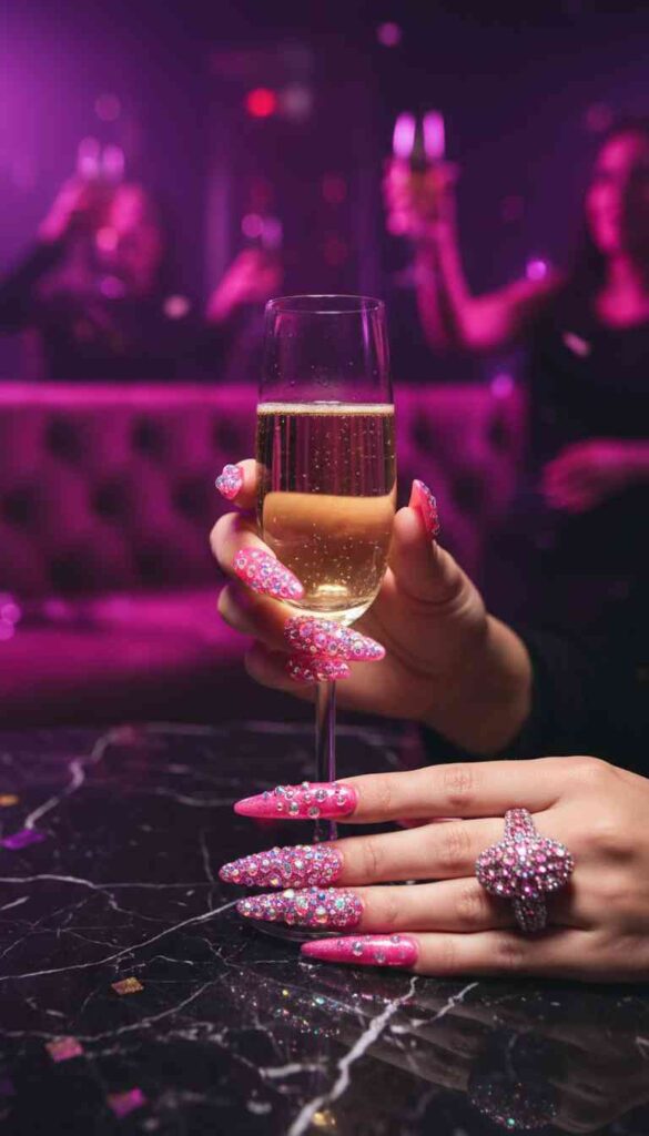 Vibrant hot pink stilettos with strategically placed rhinestones along the cuticle line add glamorous sparkle. The crystals catch light while the bold pink demands attention. This is unapologetically feminine and fierce.