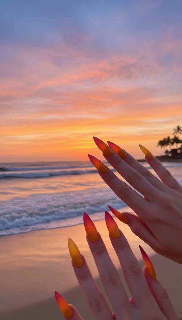 Warm gradient from yellow at base through orange to deep coral at tips mimics sunset. The colors blend seamlessly along the dramatic length. This warm design captures golden hour on your fingertips.