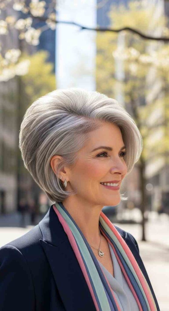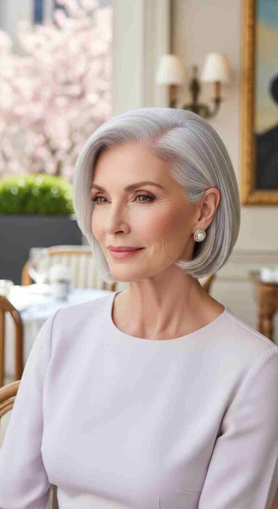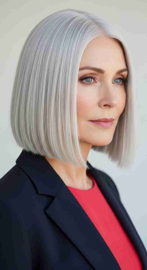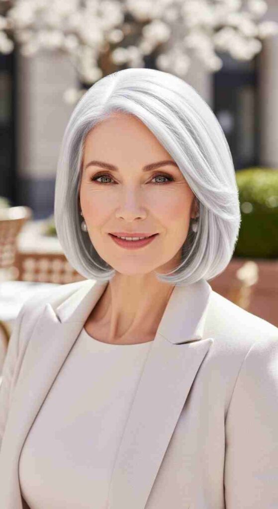 Subtly angled bob in pure silver creates sophisticated contemporary style for 60+.